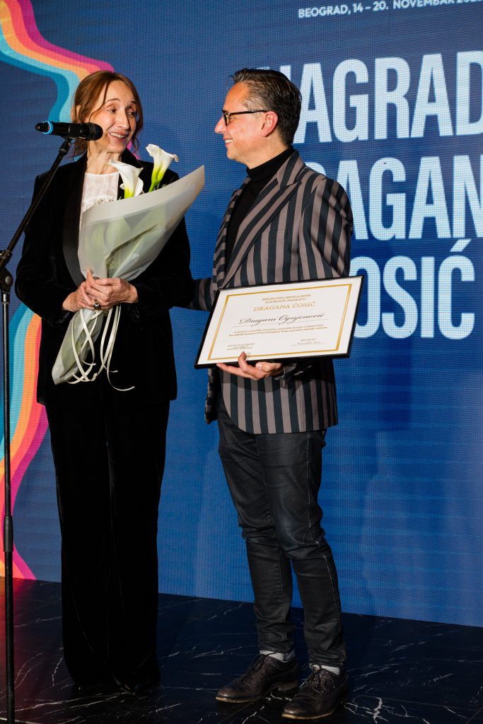 Nagrada Dragana Ćosić, koja nosi ime legendarne novinarke Studija B, pripala je jednom trenutku sa ovogodišnje Beogradske nedelje mode, a to defile revije Dragane Ognjenović u mraku sa devojkama koje nose svetlost, koju je uručila njena sestra, Suzana Ćosić.