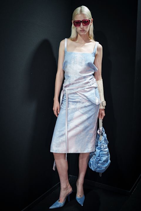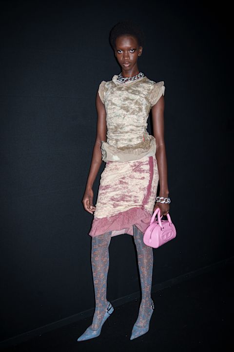 Kolekcija Diesel proleće/leto 2026. otkriva novi stil brenda. Martens je razvio inovativni satin denim – tkanina koja kombinuje sjaj svile i izdržljivost teksasa. Haljine, pencil suknje i jakne tretirane su laserskim postupkom, dok paleta boja uključuje ljubičastu, limetu i svetloplavu. Duge siluete, paneli i remenje naglašavaju proporcije, dok slojeviti komadi od jerseyja i tafete stvaraju ispucale teksture koje otkrivaju unutrašnje slojeve. Posebno se ističe animal print i imaginarna bića kojima su prekrivene mini haljine i kombinezoni.