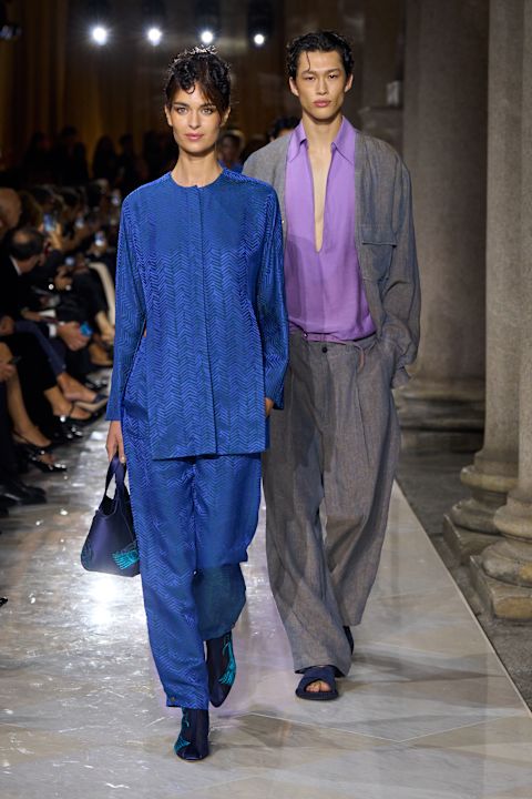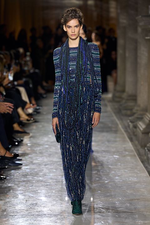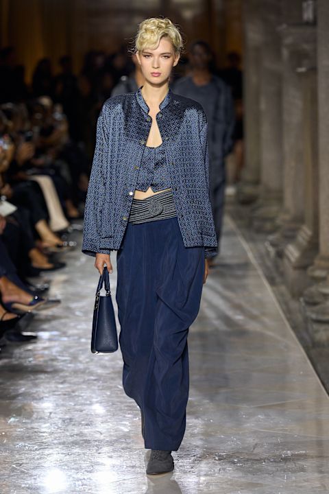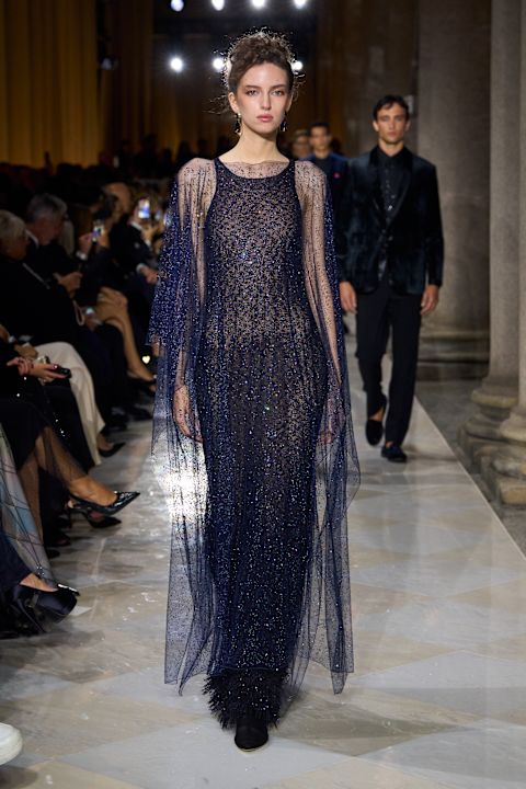 Jedan od ključnih komada, plavi prsluk-sako od pletene kože, podsetio je na same početke kuće. Na pisti su dominirali njegovi prepoznatljivi kodovi: globalni uticaji, greige i mornarska plava, dekonstrukcija, fluidnost, sofisticirano oblikovani muški proporciji za oba pola, carskopurpurna nijansa, kristali i raskošni materijali. Armani estetika u svojoj najčistijoj formi. Najveće iznenađenje večeri? Po prvi put – nijedan šešir u kolekciji.