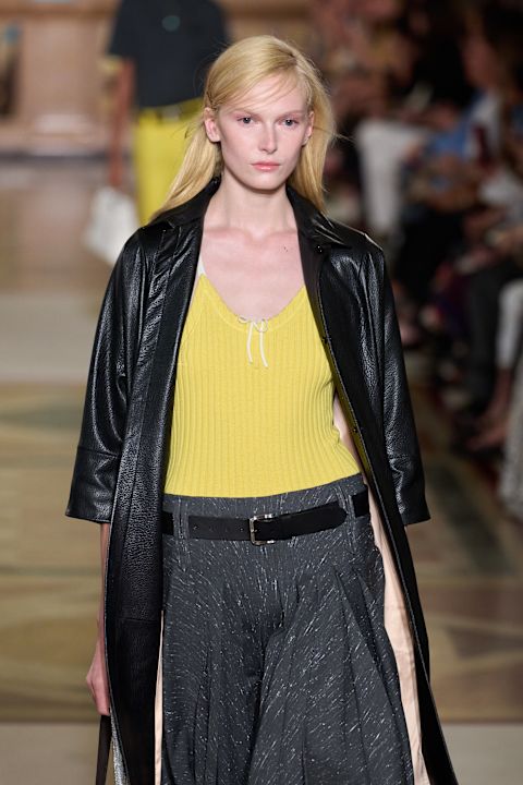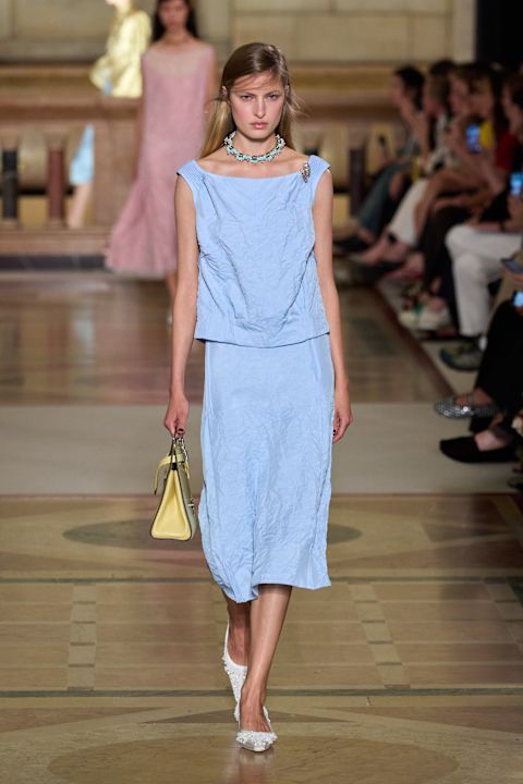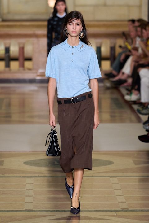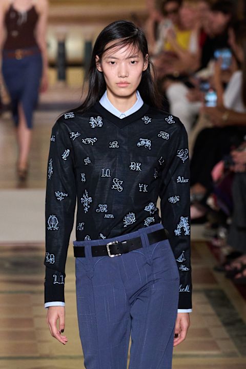 Kolekcija je ispunjena pažljivo osmišljenim detaljima: origami kragne na pletenim polo majicama, reveri s diskretnim prorezima kroz koje proviruje nakit, kao i perlice koje imitiraju suptilno „krpljenje“ džempera. Sakoi sa skrivenim rajsferšlusima omogućavaju transformaciju siluete, dok su pantalone niskog struka u duhu devedesetih istakle ličnu vezu dizajnerke s periodom u kojem je započela karijeru. Suknje, asimetrično podignute kaišem, unele su dinamiku i pokret na pistu.
