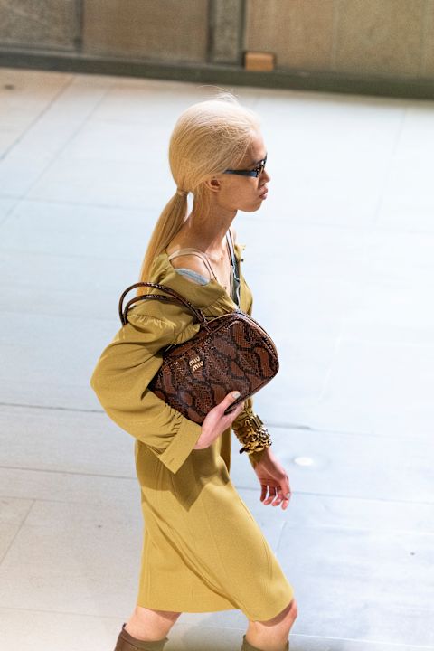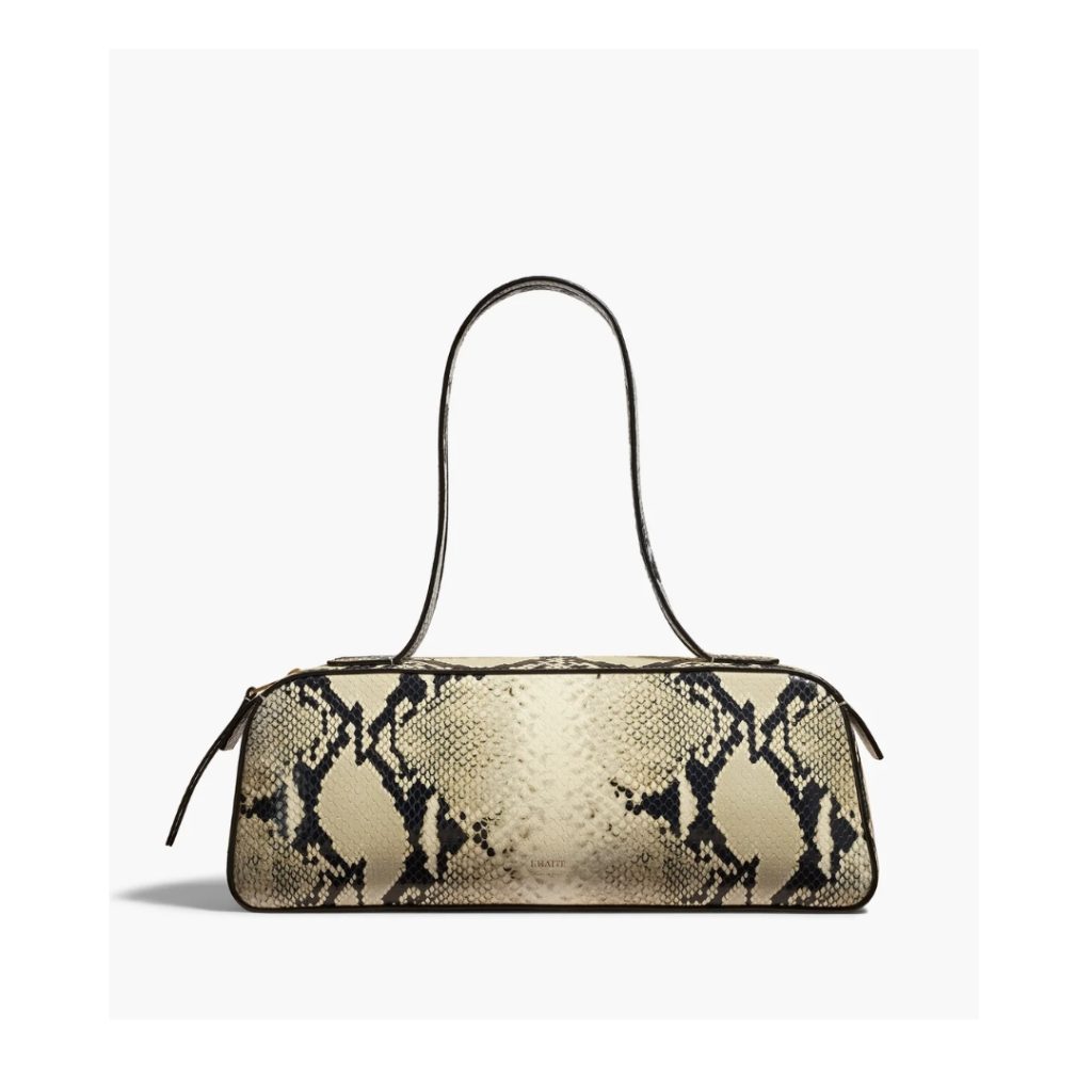 Leopard je ove godine ustupio tron za zmijski print. Valentino, Miu Miu, Khaite i Stella McCartney predstavljaju torbe u tonovima prirodne sive, tamne čokolade ili modernoj pastelno žutoj. Bez obzira na boju, efekat je snažan, a torba sa zmijskim printom lako postaje fokus odevne kombinacije.