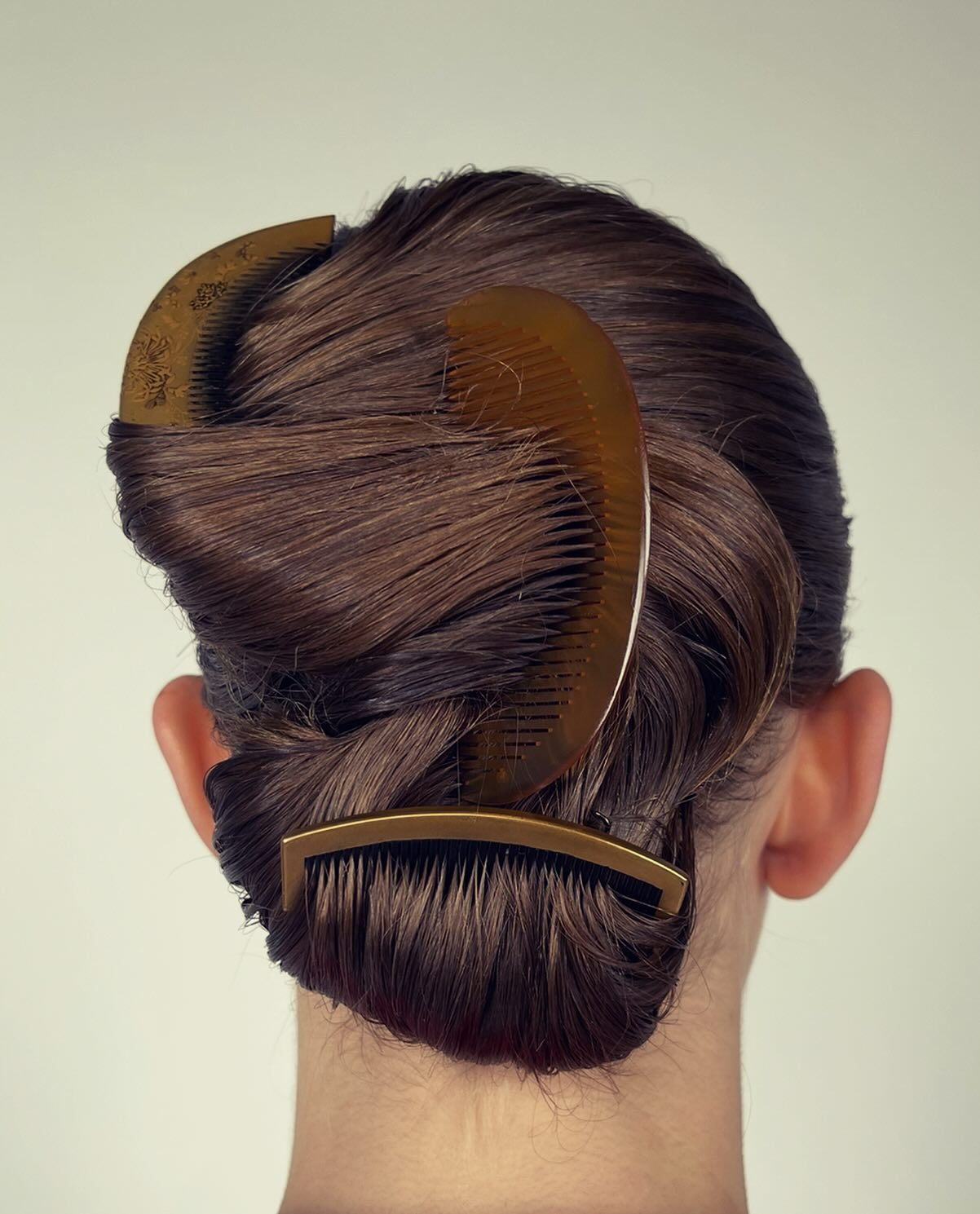 Dok su modeli hodali u tipičnom The Row ritmu, pažnju je privuklo nešto neočekivano: kosa oblikovana u savršeno zaglađene forme, uokvirena velikim češljevima umetnutim u punđe. Umesto klasičnih ukosnica ili šnala, Palau i njegov tim (među njima i dugogodišnja saradnica Sandy Hullett) odlučili su da frizuru ukrase predmetima koji inače služe za češljanje. Rezultat je bio gotovo skulpturalan.